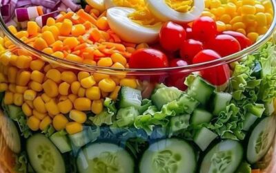 SAŁATKA SIEDMIOWARSTWOWA 🥗 📝 Składniki: Warstwa 1: Podstawa 2 szklanki posiekanej sałaty (rzymskiej lub lodowej) 🥬 1 szklanka startego sera…