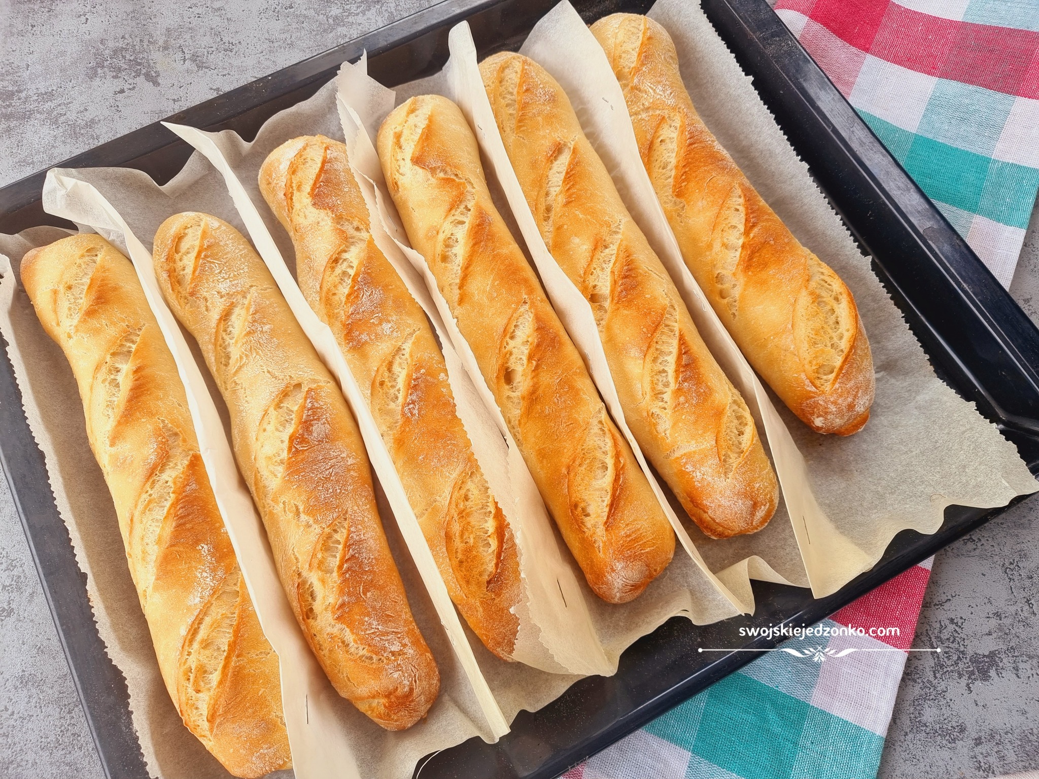 Bagietki układamy w rynienkach z papieru do pieczenia, nakrywamy ściereczką i odstawiamy jeszcze na 30 minut. Po tym czasie nacinamy nożem po skosie w kilku miejscach i wstawiamy do piekarnika nagrzanego do 230 stopni z termoobiegiem i pieczemy ok 12-15 minut. Przed pieczeniem do piekarnika na blaszkę wylewamy ok 1 szkl. wody, żeby powstała para.