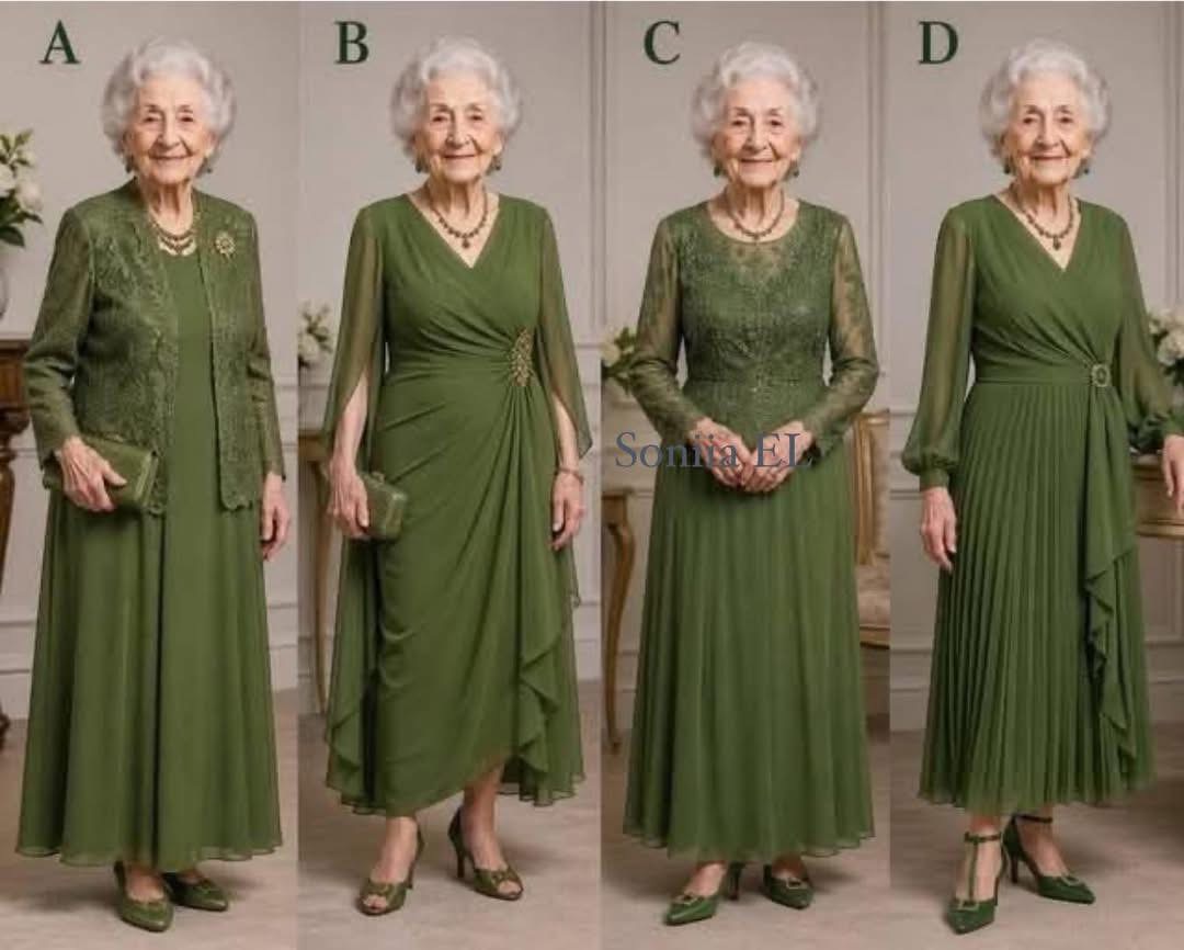Na zdjęciu widać cztery modele zielonych sukienek (A, B, C i D), które ilustrują różne sposoby na elegancję i wygodę. Każdy model pasuje do konkretnego typu sylwetki i stylu.