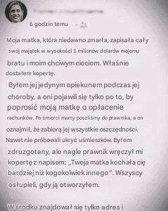 Podczas gdy zdrowie mojej matki pogarszało się, ciotka poprosiła „kontakty” mojej matki, aby pomóc jej znaleźć nowy dom. Bo moja matka prowadziła agencję nieruchomości. "Byli tacy bezczelni" - napisała kobieta.
