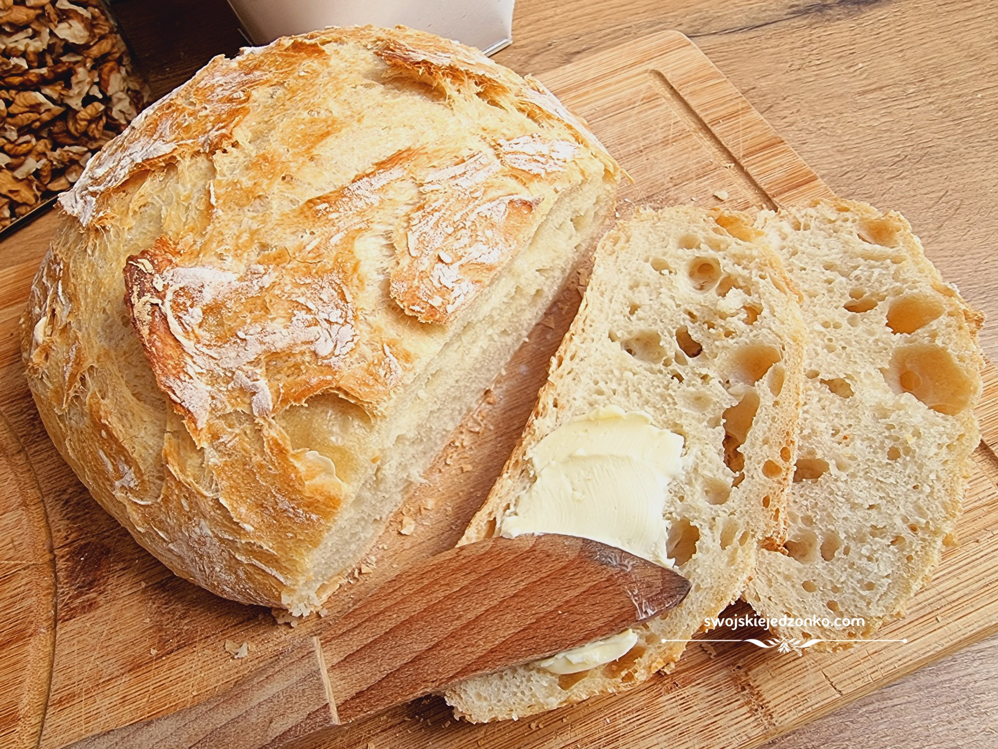 Niesamowity w smaku, zdecydowanie w pierwszej trójce najlepszych domowych przepisów na chleb. Idealna chrupiąca skórka i mięciutki wilgotny miąższ. Do tego nie trzeba wyrabiać, wystarczy zamieszać łyżką. Robi się go wieczorem dzień wcześniej i rośnie całą noc. Dzięki długiemu wyrastaniu nabiera lekko kwaskowego posmaku i cudownej konsystencji. Polecam gorąco nie będziecie żałować.