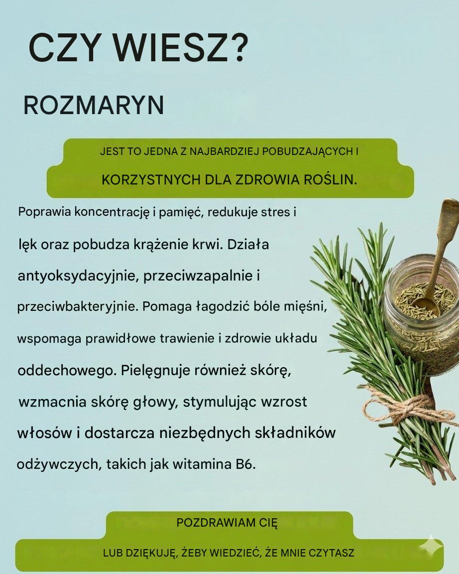 Rozmaryn to aromatyczne zioło, szeroko stosowane w kuchni i medycynie tradycyjnej ze względu na swoje liczne dobroczynne właściwości. Znany jest ze swojego pobudzającego działania na ciało i umysł, co czyni go popularnym dodatkiem do codziennej rutyny.