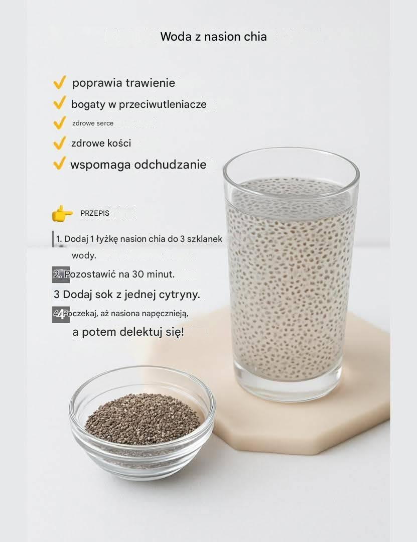 Woda z nasion chia to nie tylko pyszny i orzeźwiający napój, ale także jeden z najcenniejszych przepisów prozdrowotnych, jakie możesz przygotować w domu. Dzięki bogatym właściwościom odżywczym, ta prosta mieszanka stanowi idealne uzupełnienie codziennej rutyny. Poprawia trawienie, wspiera układ sercowo-naczyniowy, utrzymuje zdrowe kości i wspomaga odchudzanie. Jeśli szukasz naturalnego sposobu na optymalizację swojego zdrowia, woda z nasion chia jest właśnie dla Ciebie.