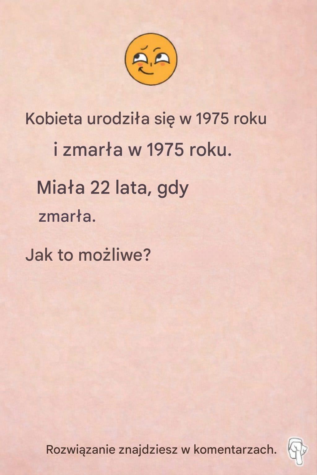 Wyobraź sobie: przeglądając wiadomości, natrafiasz na dziwne sformułowanie. „Kobieta urodziła się w 1975 roku i zmarła w 1975 roku. Miała 22 lata”. Nagle zatrzymujesz się w miejscu. Niejasne? Niepokojące? Gdzieś musi być haczyk… ale gdzie? Przygotuj się, bo ta zagadka wystawia na próbę twoją logikę, refleks i wymaga odrobiny wyobraźni. A co, jeśli kluczem nie jest myślenie w typowy sposób?